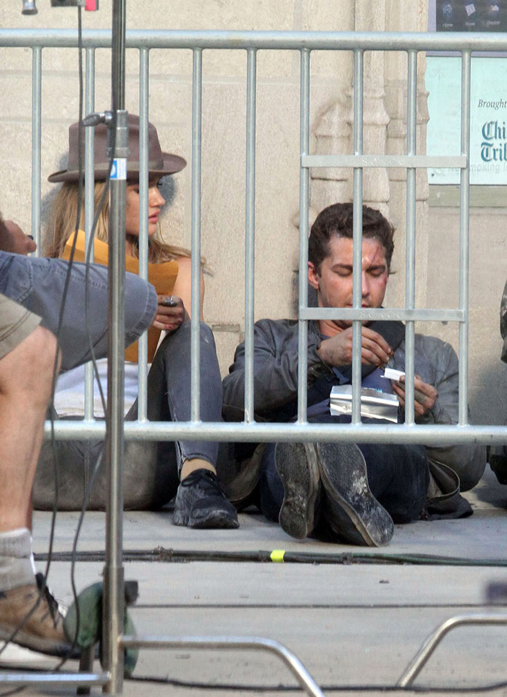Shia LaBeouf and new addition to the franchise Rosie Huntington-Whiteley enjoy some downtime on the set of Transformers 3 in Chicago, IL on July 18, 2010 where the courteous Shia rolled some DIY Bally Shag cigarettes for him and his new leading lady
